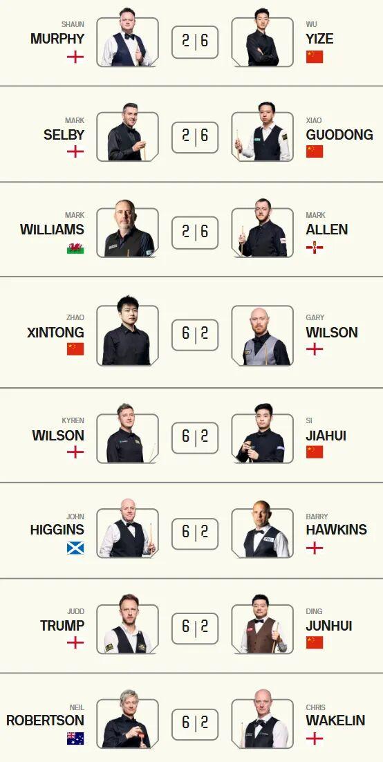 WANMEI SPORTS-奇怪的默契增加了!斯诺克大师赛首轮比分全是6-2。三名中国选手闯入八强